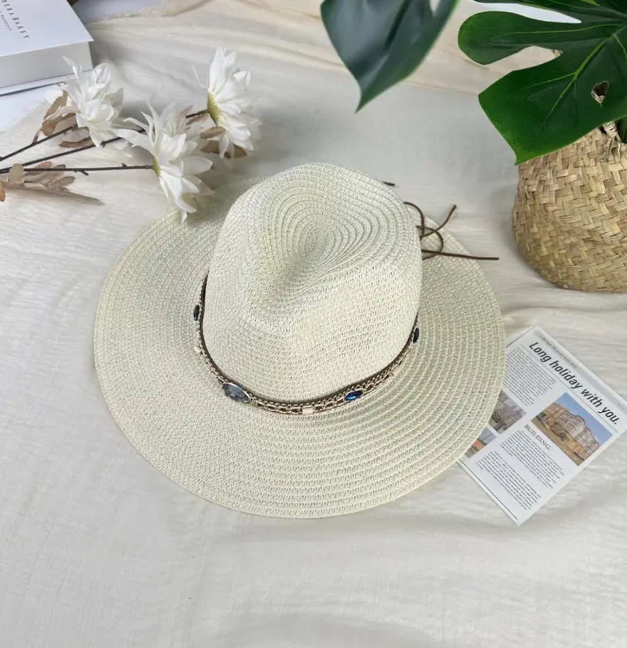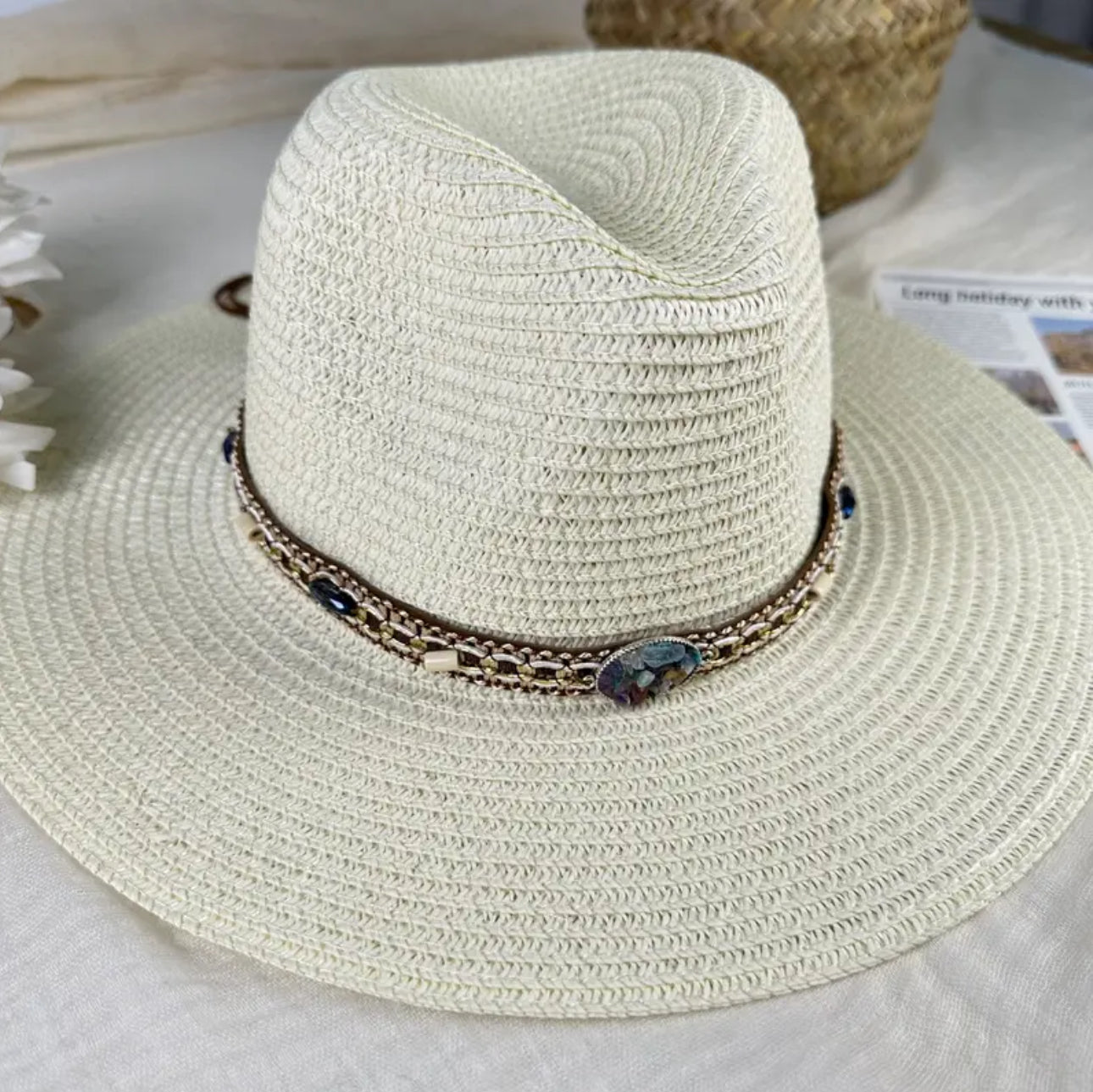 Beige Boho Chic Wide Brim Breathable Straw Sun Hat with Stylish Beaded Removable Hat Band- Provides Uv Protection and is Perfect For Beach & Casual Wear