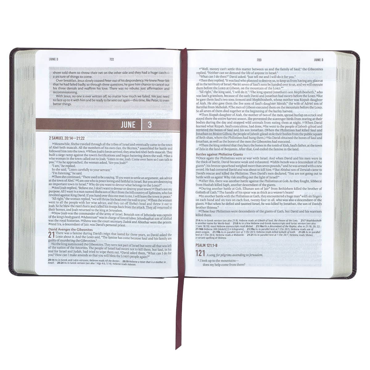 Reading from the Cross Walnut Brown Faux Leather NLT Everyday Devotional Bible for Men will lead to a more intimate relationship with God. This devotional Bible is designed to guide you through reading the entire Bible in a year, with two accompanying devotionals each day to help you apply the text.  Modern gold-foiled and heat-debossed cross cover design, Walnut brown faux leather, Gold-foiled spine title, Heat-debossed translation, Flexcover, New Living Translation, Satin ribbon marker, 1824 gilt-edged pages, Two-color interior, Single column format, Presentation page, Daily portions from Psalms, Proverbs, Old and New Testament 730 inspiring devotional insights by Mike Beaumont, 10-point text, Packaged in a full-color printed cardstock sleeve, Size: 9.6" x 6.8" x 1.8" (244 x 173 x 46mm)