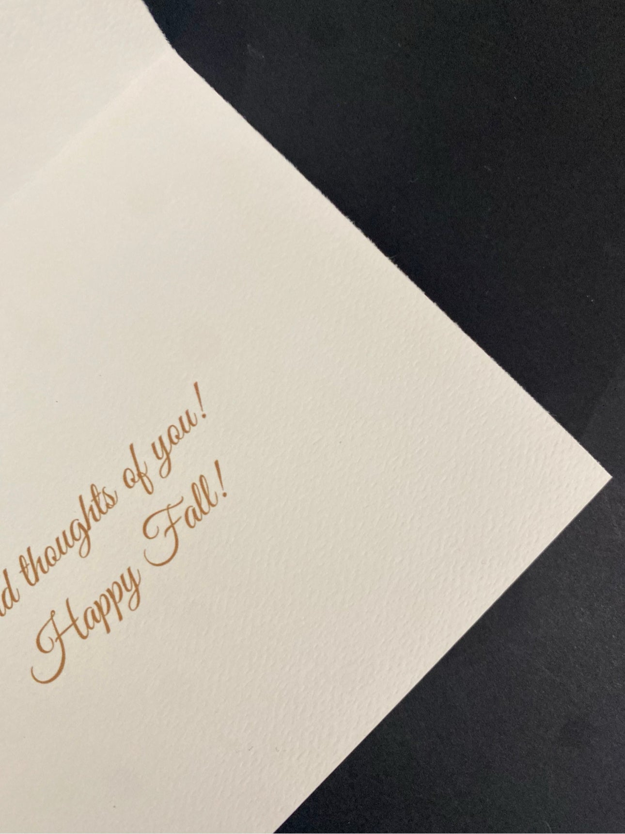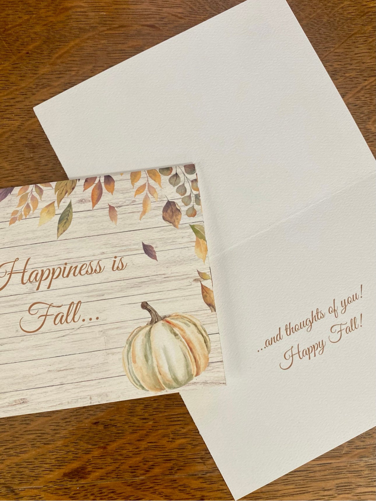 Share a happy note with this set of Fall greeting cards. Each card has a full print cover and a simple message on the inside with plenty of room to write a personal message to the recipient. Each card is carefully printed on Textured Matte White 4.25 x 5.5 65 lb. Heavyweight paper. The Matte finish supports sharp text and vivid colors. They are perfect for fall, Halloween, and Thanksgiving or just to say hello to a special friend! They can be used on their own or paired with a lovely fall gift. They are sure to brighten anyone’s day!