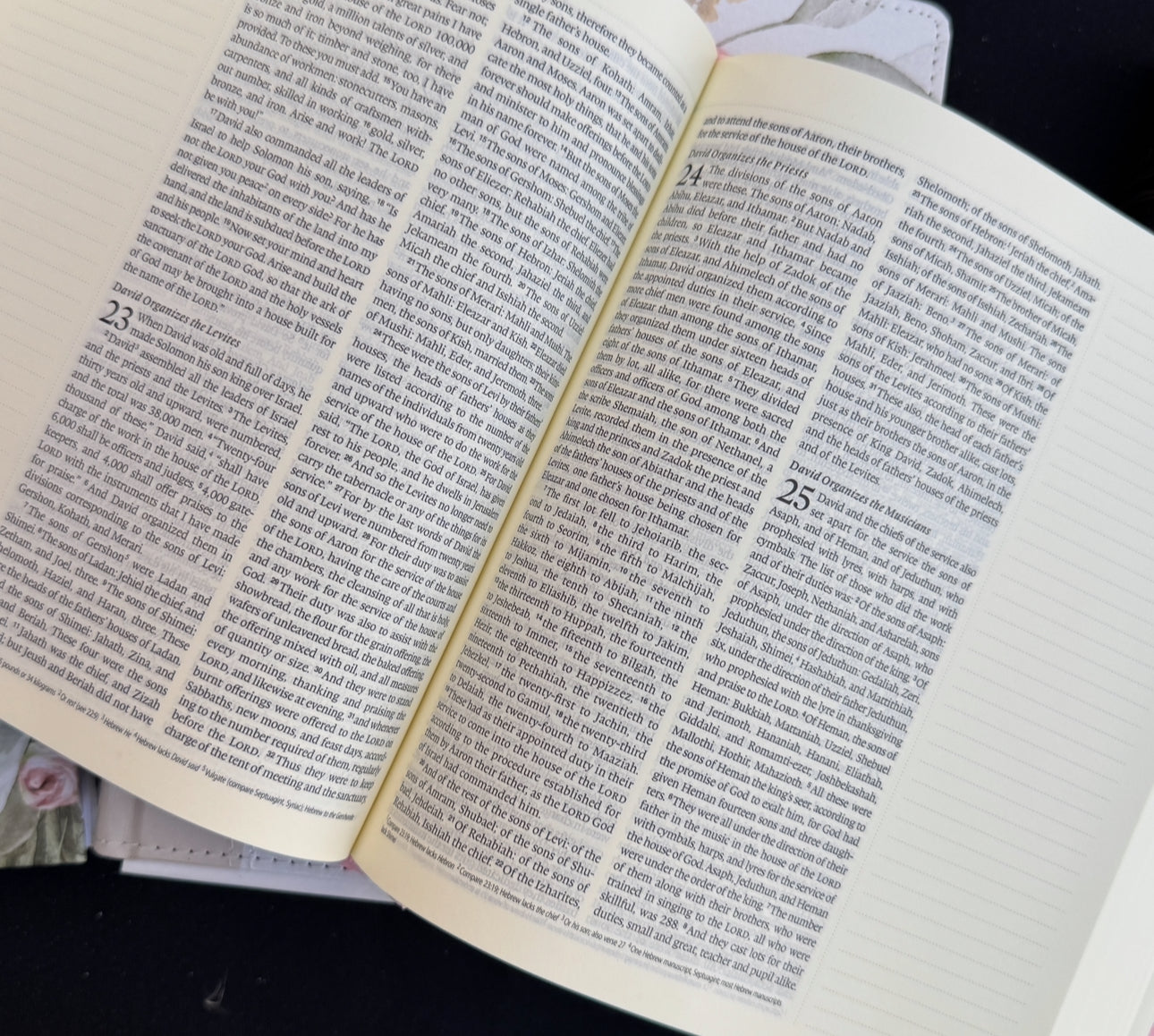 Every page is a creative canvas with generous 2-inch wide ruled margins, perfect for jotting down reflections, prayers, and insights as you dive into the Word. The double-column paragraph format makes for intuitive reading and note-taking, ensuring you won’t miss a single revelation.