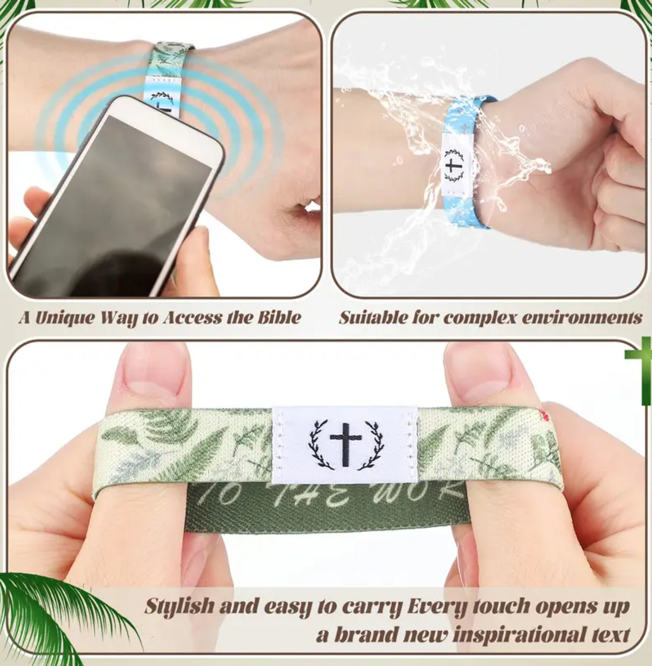 Discover inspiration and style with our Inspirational Bible Verse Bracelet, crafted in a beautiful bohemian style featuring various unique color palettes. They offer a unique and stylish way to access the Bible! Tap to access! Simply follow the directions on the enclosed card to access a a new inspiration passage each day! Made from vintage knitted fabric, this bracelet serves as a heartfelt reminder of faith and positivity. Perfect for daily wear or as a thoughtful gift for a loved one, it beautifully combines faith with fashion, making it a meaningful accessory that uplifts the spirit and expresses your beliefs wherever you go. Wear it as a personal testament to your journey or share it with someone special to inspire them to read God’s Word daily!