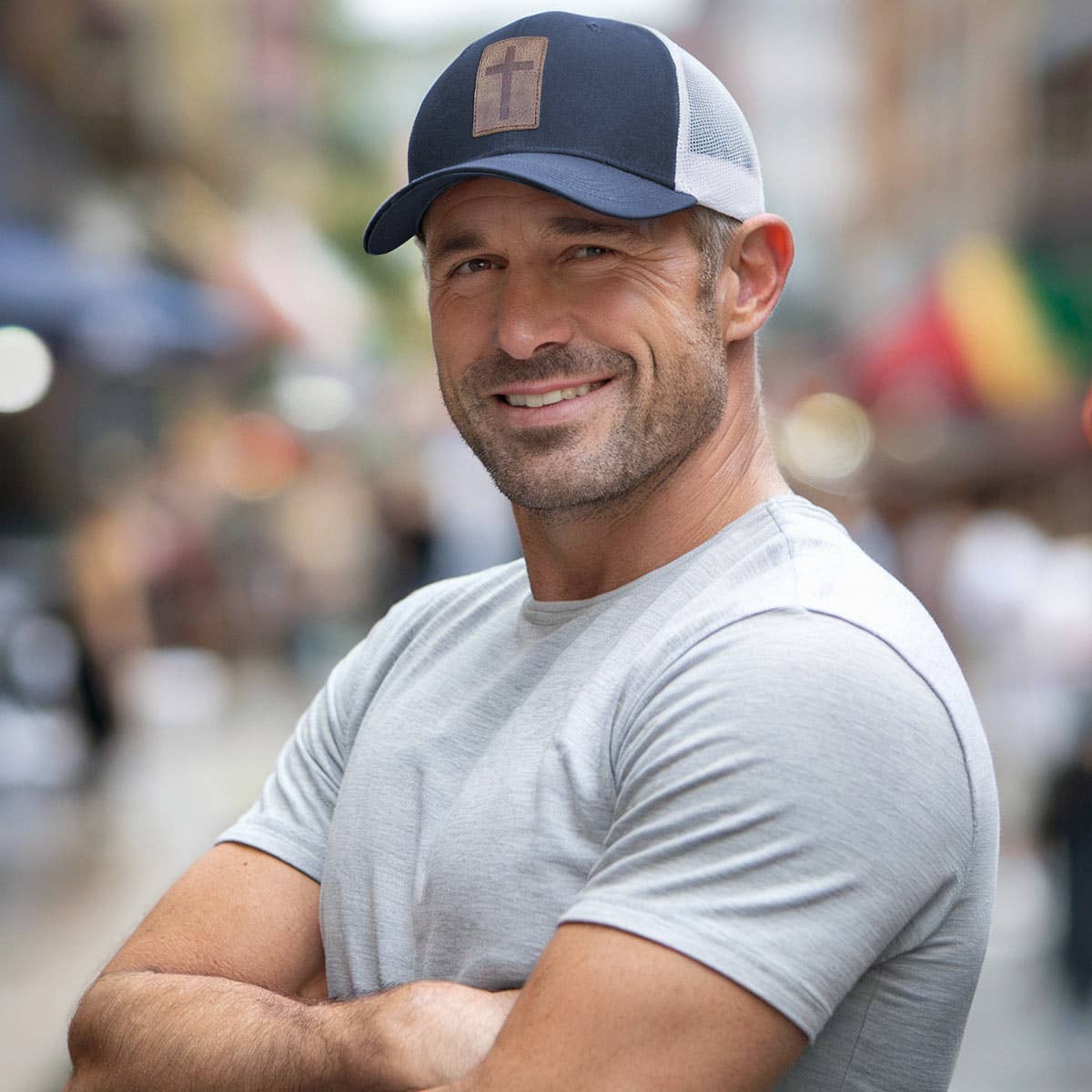 Leather Cross™ Send a stylish message of faith in this mid-rise “Leather Cross” Cap by Kerusso® in Blue/White. The Lord goes before you in all things, and faith in Him makes all the difference in this life. A genuine leather patch in a handsome tobacco finish puts the cross front and center on this design. Sharing the Good News about Jesus is as easy as getting dressed. Let your hat or T-shirt get the conversation going, and you can fill in the rest. Special details on this classic cap include a genuine leather patch, coordinating seam tape, and an adjustable snap-back closure; this hat is One Size Fits Most. Kerusso® Adult Cap - Leather Cross™ * Color: Blue/White * 100% Cotton front * 100% Polyester back * Mid-rise/Pre-curved visor * Debossed leather patch * Snap back closure * Do not launder