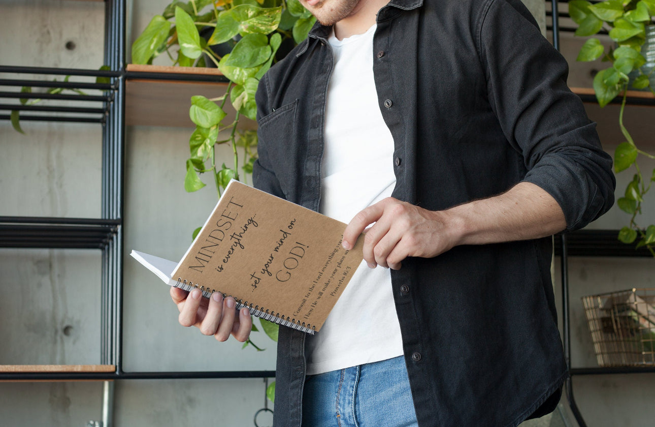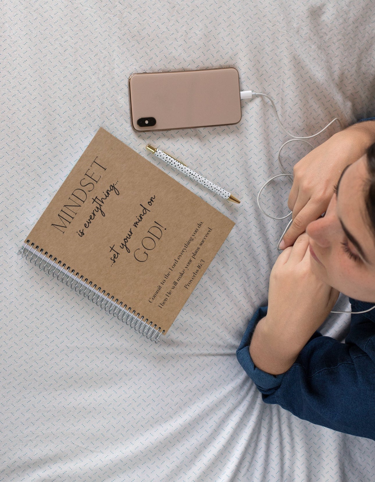 This is a simple yet elegant notebook. The note book is covered in an eco-friendly soft Kraft brown paper with an encouraging quote and scripture on the front cover.