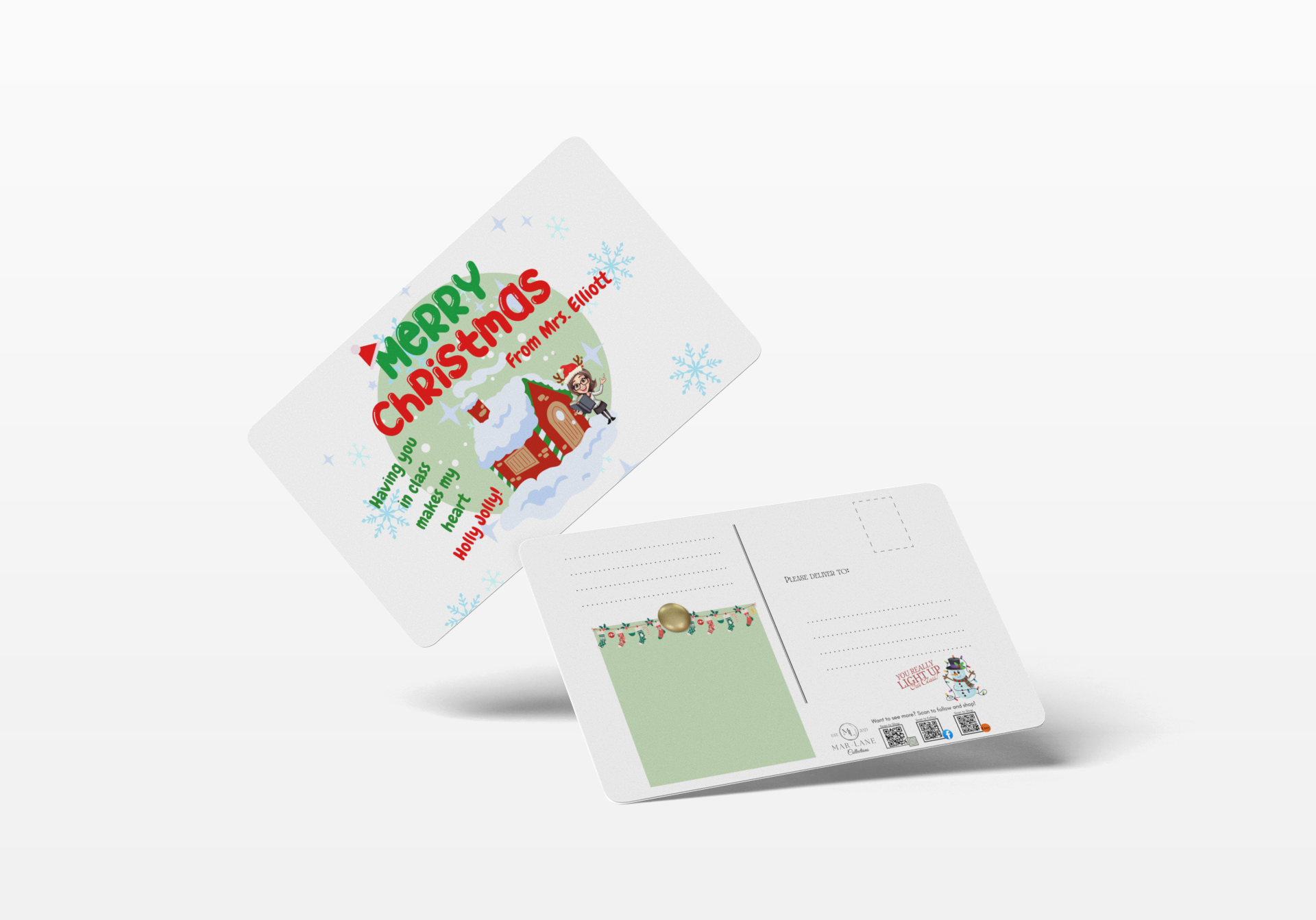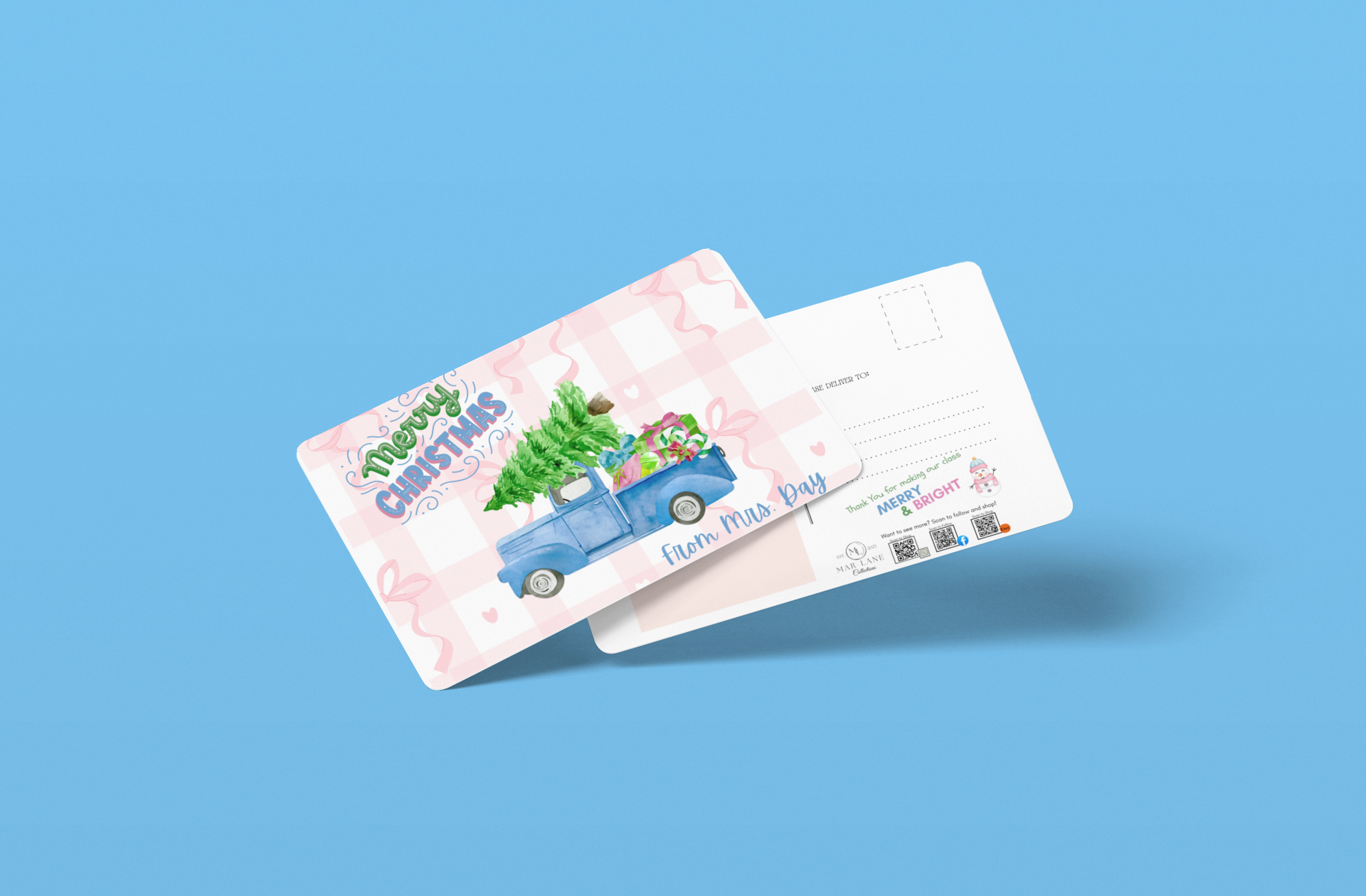 Merry Christmas Personalized Postcards from Teacher! 3 designs and 2 styles! Rounded or Squared Corners! Give your students the excitement of receiving their very own mail over the holiday break! Set of 24 postcards!