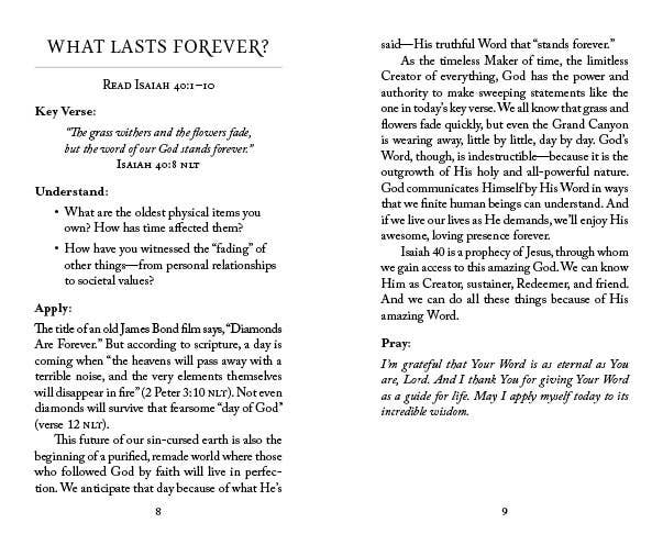 Let the Powerful Truth of God's Word Lead Your Life. . .in Just 5 Minutes! Do you find it hard to make time for Bible study? You intend to do it, but before you know it, another week has passed and you haven’t picked up God’s Word. This book provides simple tools for you to open the Bible regularly and dig into God's Word—even if you only have five minutes! Minutes 1–2: Read a few verses pulled from a lengthier passage. If time allows, read the full passage listed for you in each Bible study. Minute 3: Understand. Consider thoughtful questions designed to help you apply the verses from the Bible to your own life. Consider these throughout your day as well. Minute 4: Apply. Read a brief devotional based on the scripture you read. Think about what you are learning and how you can apply the scriptural truths to your own life. Minute 5: Pray. A prayer starter will help you to begin a time of conversation with God.