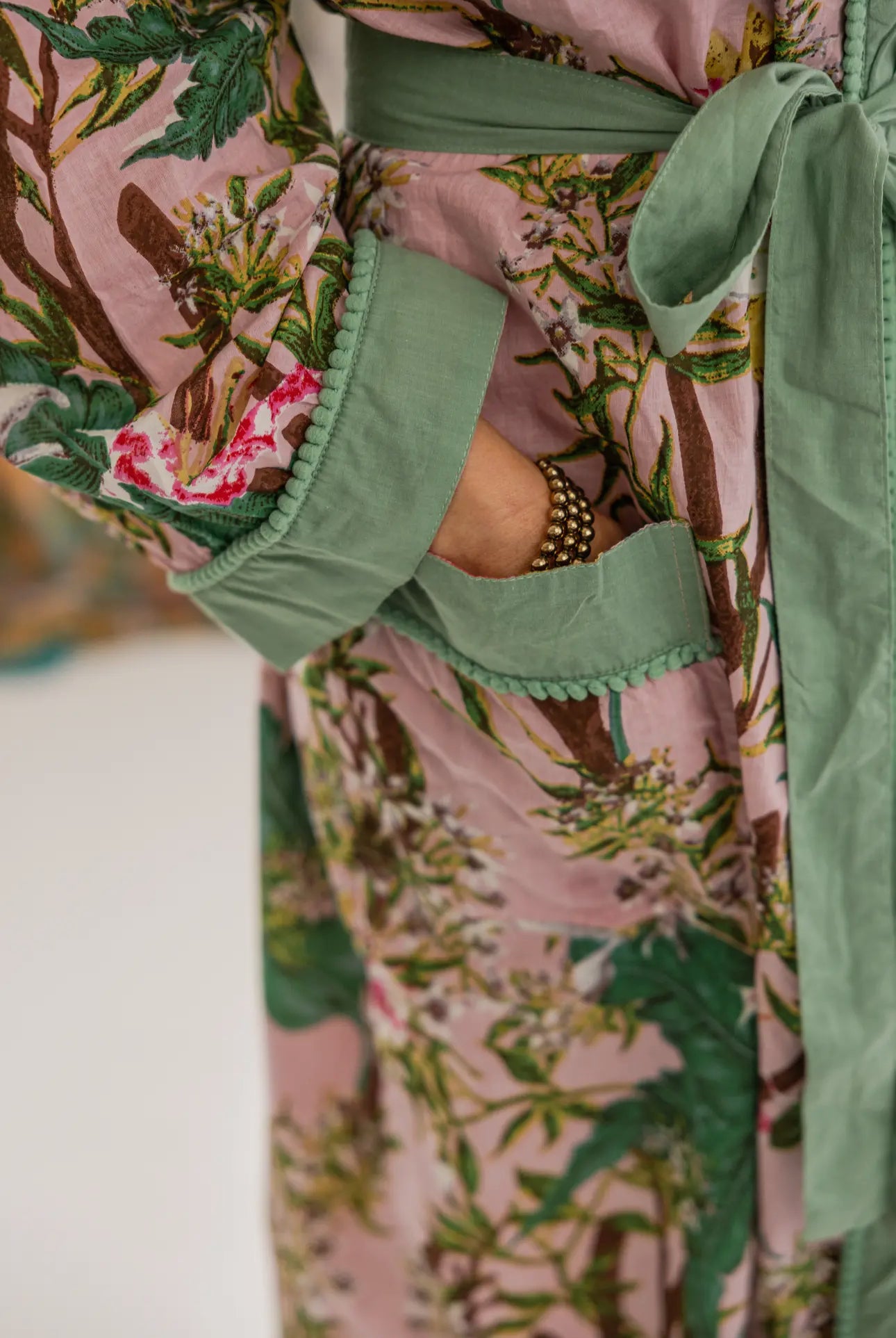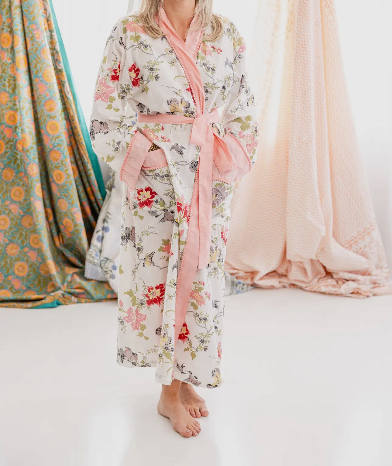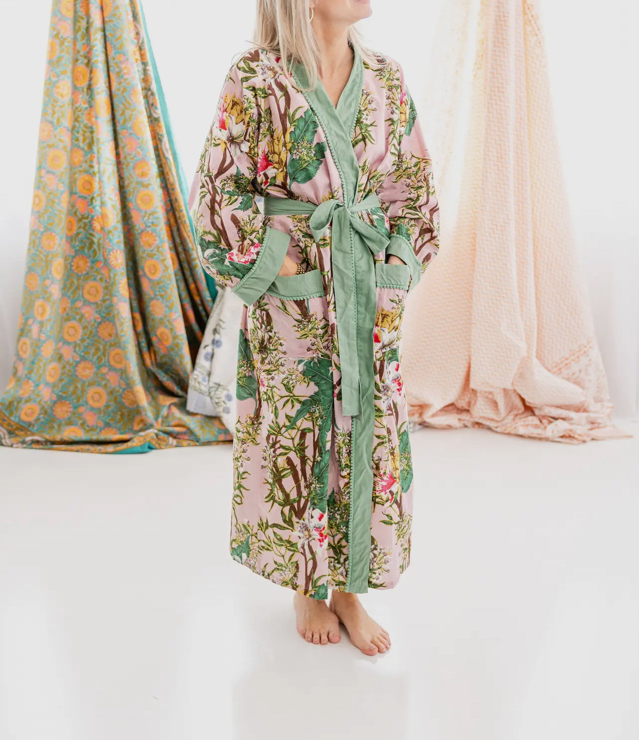 Rehab's Rope is a faith-based company in Georgia dedicated to empowering women and children in the fight against human trafficking, with profits from product sales fueling their vital mission. Among their many beautiful offerings are these enchanting Indian block print paradise cotton robes—a timeless craft of dyeing and coloring with wooden blocks, perfected over generations. Each robe is a cozy embrace, perfect for lounging at home or on a blissful getaway. They are lightweight and airy making them perfect for where in the spring and summer season. Inspired by love, peace, and happiness, these robes come from an artisan company renowned not only for their exceptional craftsmanship but also for the care they provide to their employees and their extended families. Wrap yourself in one and join the movement to make a difference!