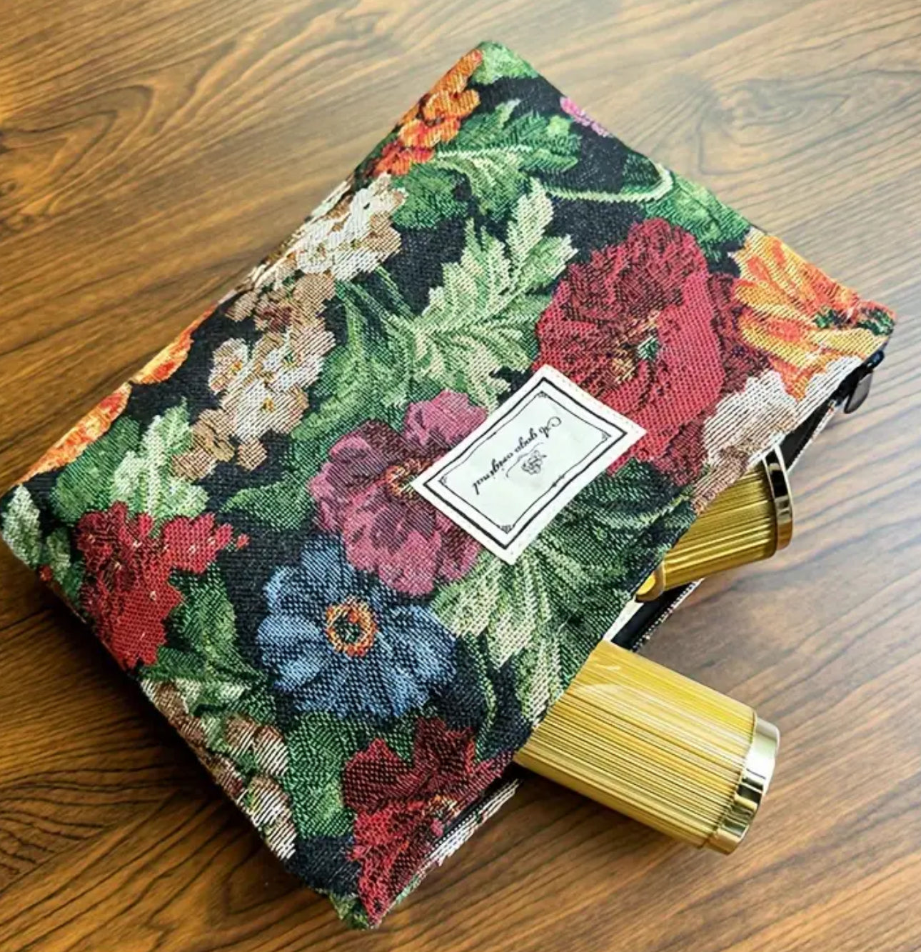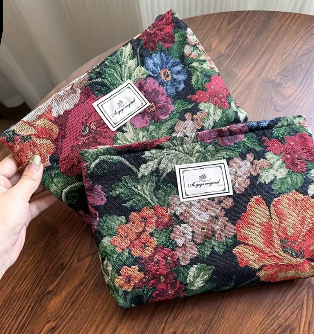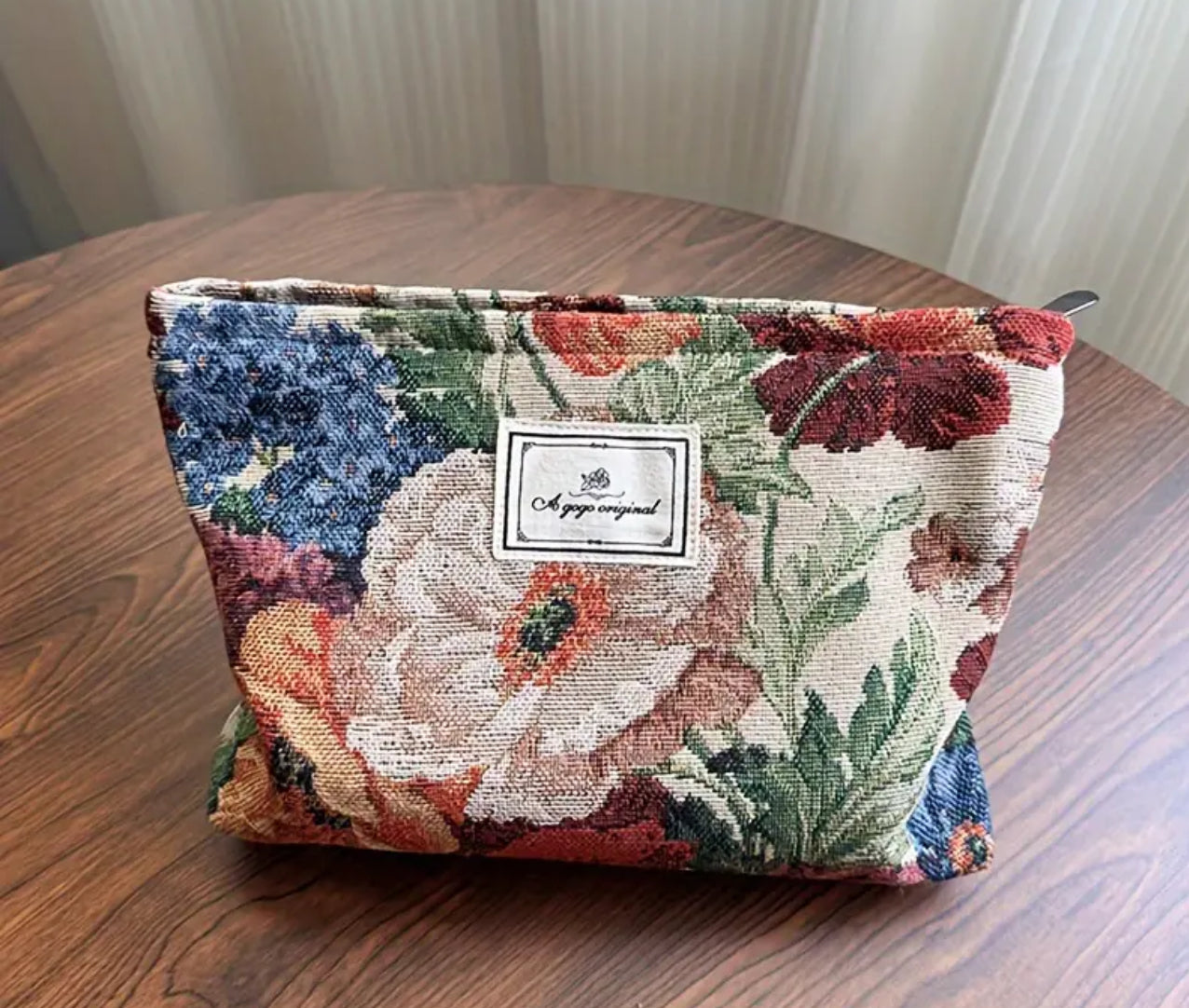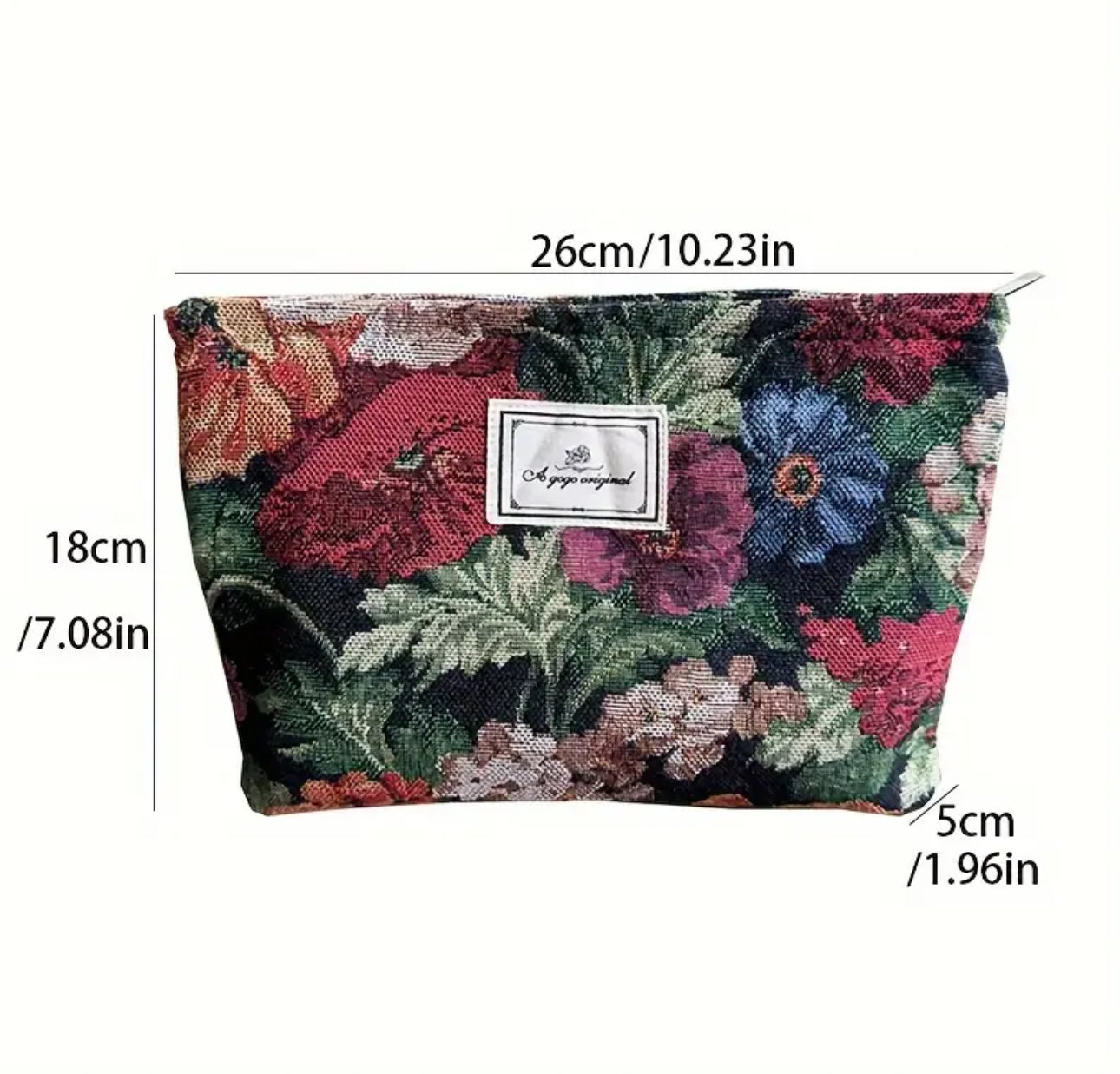 Vintage Floral Makeup Bag Textured Fabric Handbag Travel Skincare Storage Bag Toiletry Bag, Retro Style