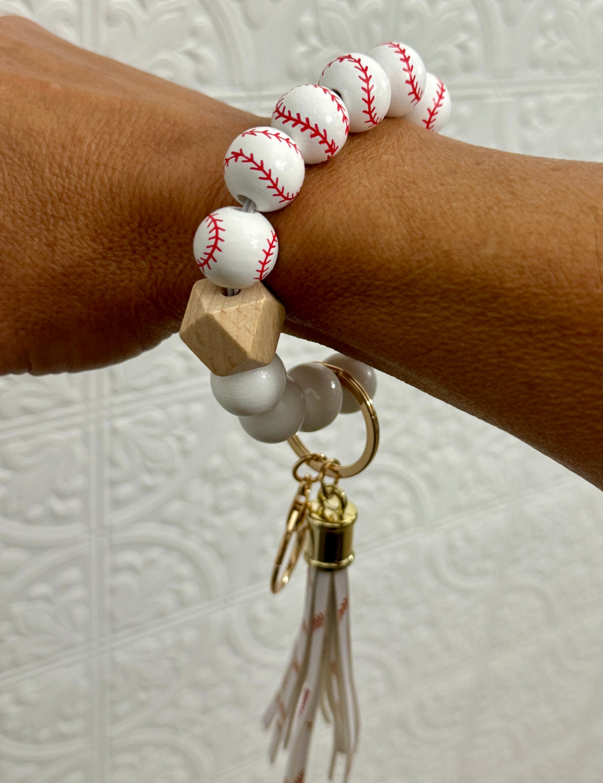 Step up to the plate and show off your love for America's favorite pastime with our Baseball Wooden Bead Wristlet Keychain! This playful accessory features a charming baseball design made from wood beads, making it the perfect way to add a touch of sports-inspired style to your keys.