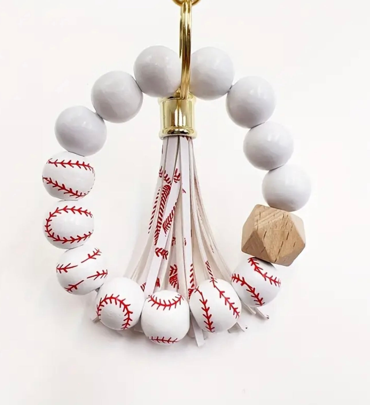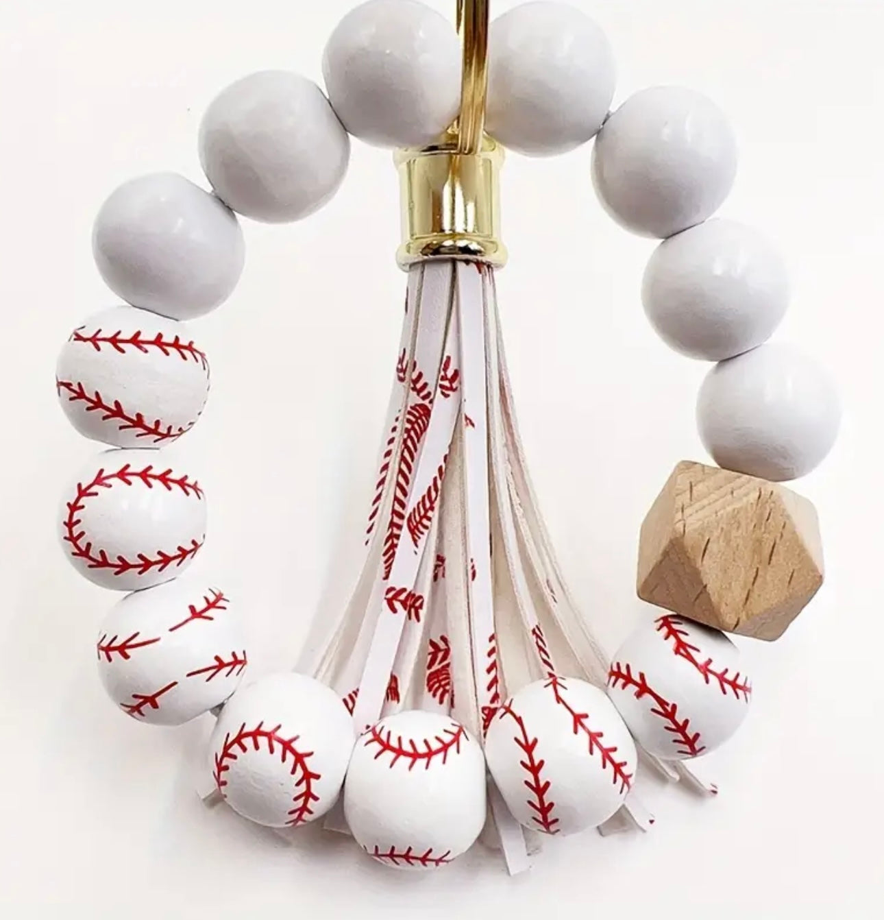 Wooden Bead Baseball Wristlet Keychain with PU Leather Tassel and Lobster Clasp